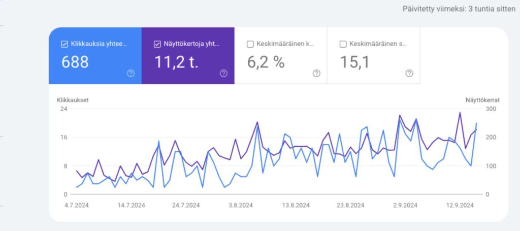Hakukoneoptimointi Delimedian kanssa on yhtä SEO-juhlaa. Voit tarkistaa tilanteesi itse ja huomata useimmiten jo hyvin nopeasti selkeää kävijämäärän nousua Google Search Cosolessa. Miten me sen teemme? Kehitämme verkkosivuston sisältöä ja rakennetta niin, että siinä käsitellään kaikki bisnekseesi liittyvät asiat syvemmin ja yksityiskohtaisemmin kuin kilpailijasi tekevät. Näin voitamme kärkisijoituksia Googlessa ja kilpailija jää kauas taakse. Ei ole väliä vaikka kilpailija olisi liikevaihdollisesti isompi kuin sinä olet. Me voimme silti tehdä parempaa työtä ja näkyä Googlessa yhtä isona tai suurempana. Auktoriteettisi nousee sekä Googlen että asiakkaittesi silmissä. Lue täältä mitä digimarkkinoija oikeastaan tarkoittaa.