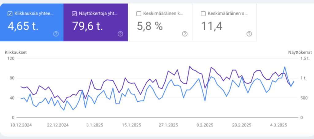 Hakukoneoptimointi palveluna meillä on sitä, että koko sivuston sisältö rakennetaan näkyvyyden ehdoilla harkitusti, tavoitteellisesti ja valmiiksi asti. Teen avainsanatutkimuksen, suunnittelen rakenteen ja kirjoitan tekstit, jotka parantavat hakukonenäkyvyyttä ja tuovat oikeita kävijöitä sivustolle. Palvelu ei jää yleiseksi ohjeistukseksi vaan etenee käytännössä: sisältö toteutetaan niin, että Google ymmärtää ja asiakkaat löytävät.